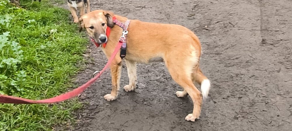 Sie kennt das Laufen an der Leine, das Mitfahren im Auto und das Treppenteigen. Sie befindet sich noch in Bulgarien und kann jeden Monat ausreisen.